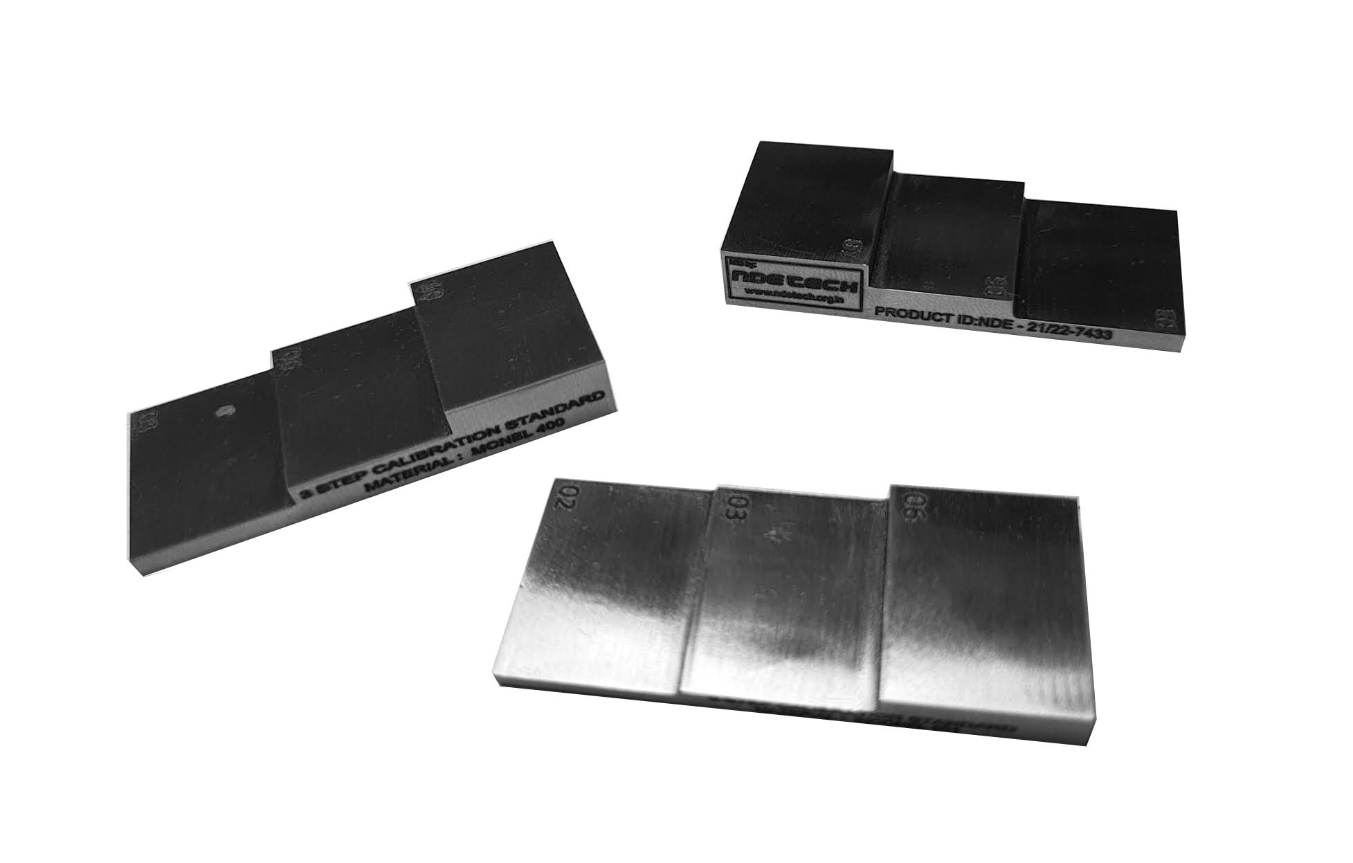 Step calibration wedges come in a large variety of sizes and configurations. Step wedges are typically manufactured with four or five or steps but custom wedge can be obtained with any number of steps. 3 Step Calibration Block for thickness and linearity calibration 3 Step Calibration Block 0.4mm – 2.0mm with two EDM flaws. Includes Test Report Traceable to NIST and Certificate of Conformance.